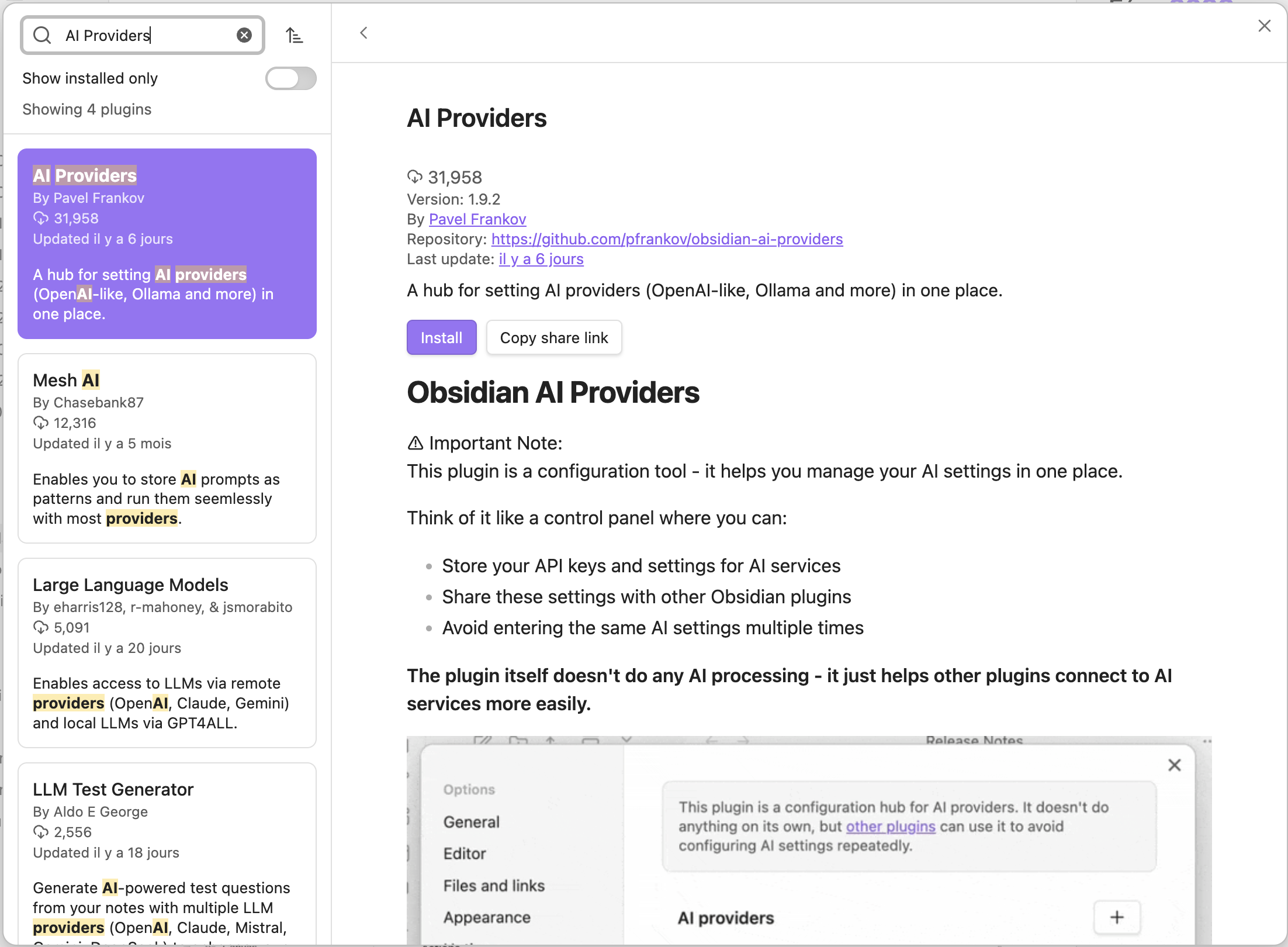 1. In Obsidian, go to “Settings → Community Plugins → Browse” and search for “AI Providers”.