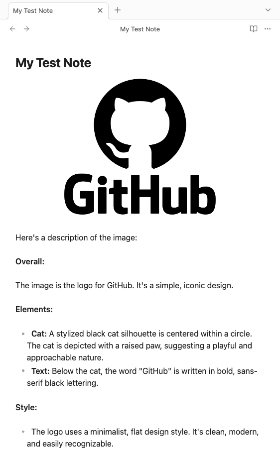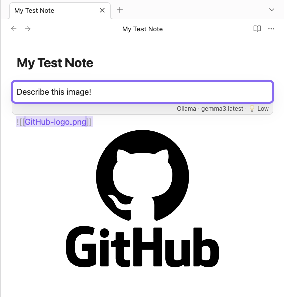 Let’s say I want to analyze an image to describe its content. I would select the image in my note, open the action palette, and type: “Describe this image!”