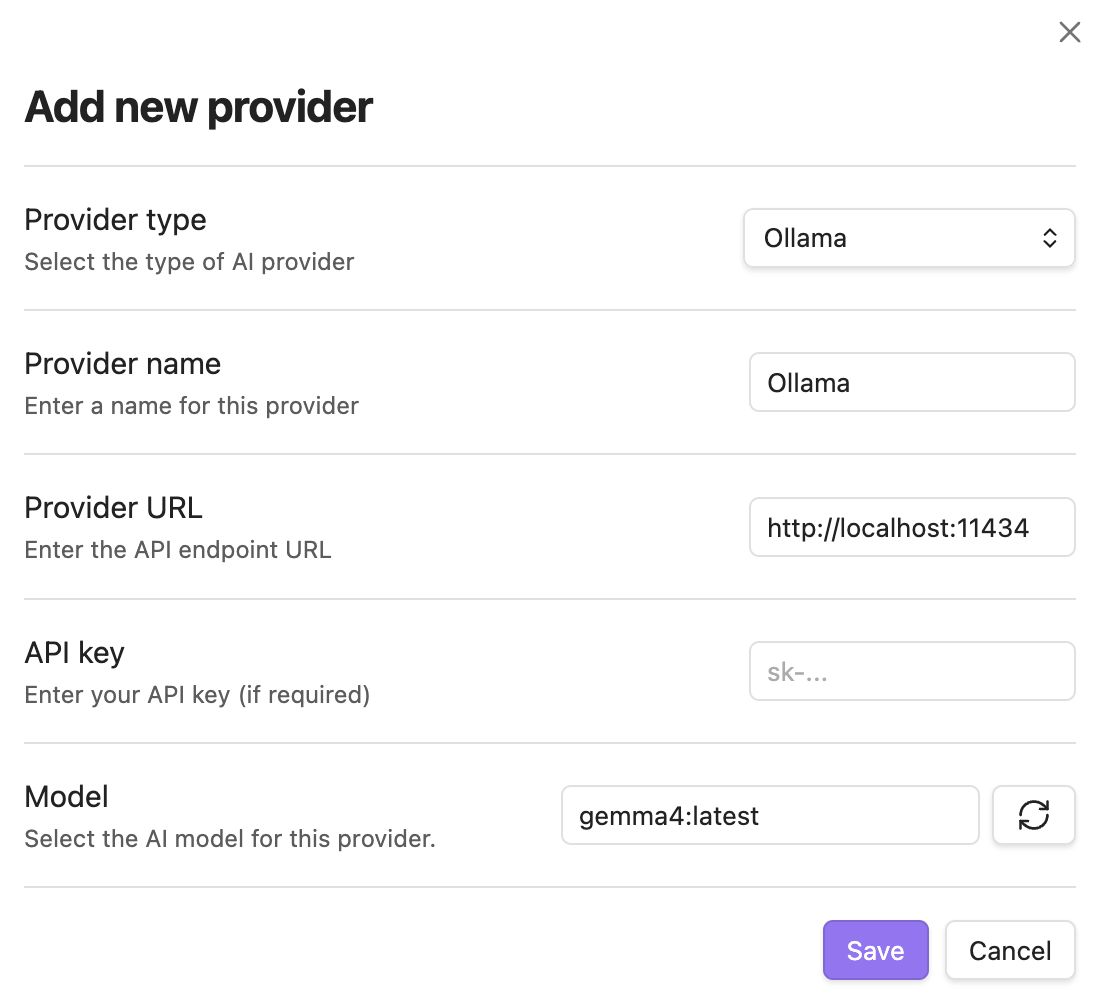 • Click on the refresh icon of the “Model” field to fetch Gemma 4 from your local Ollama installation.