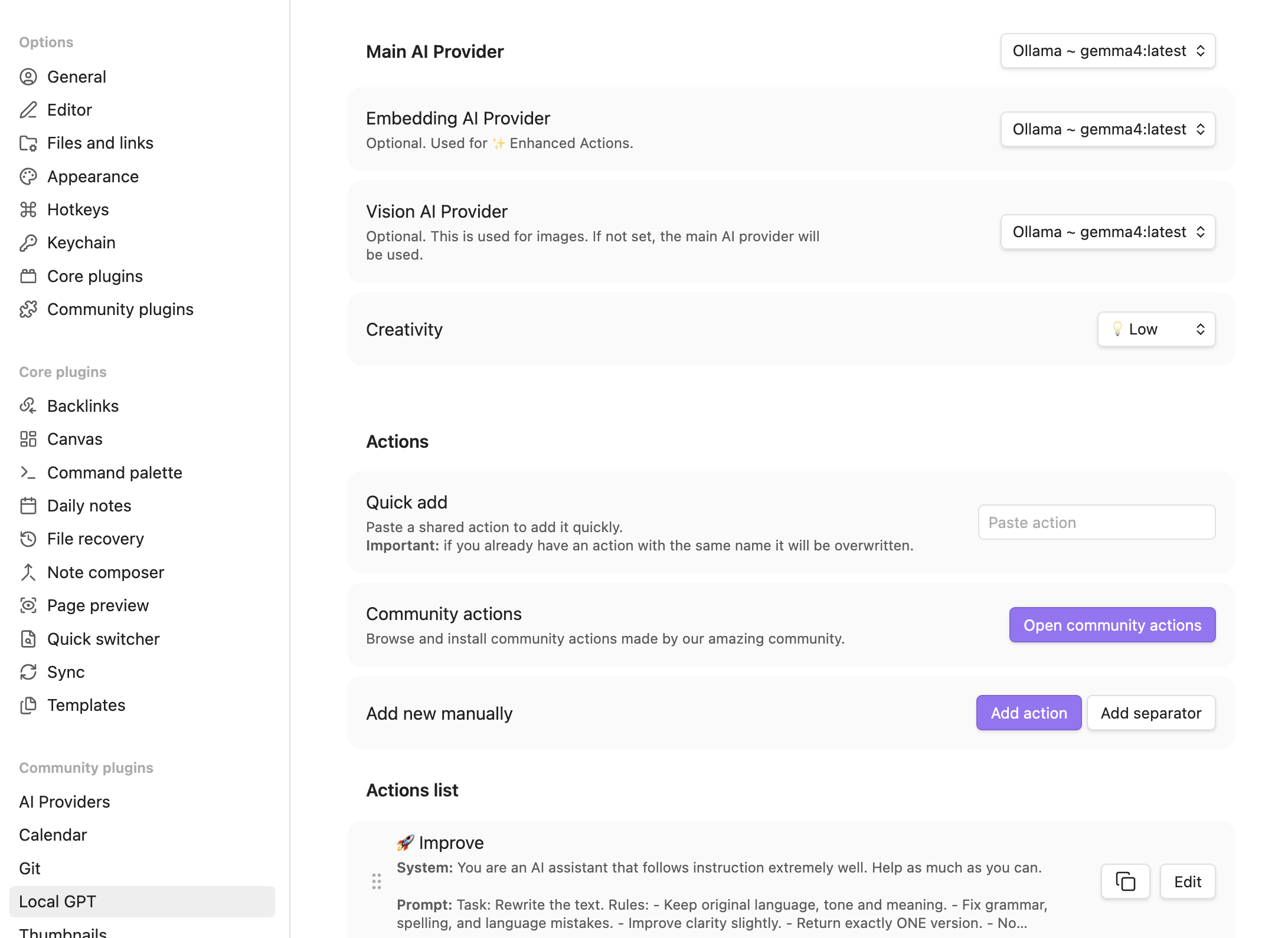 This plugin is a hub for setting AI providers (OpenAI-like, Ollama and more) in one place.