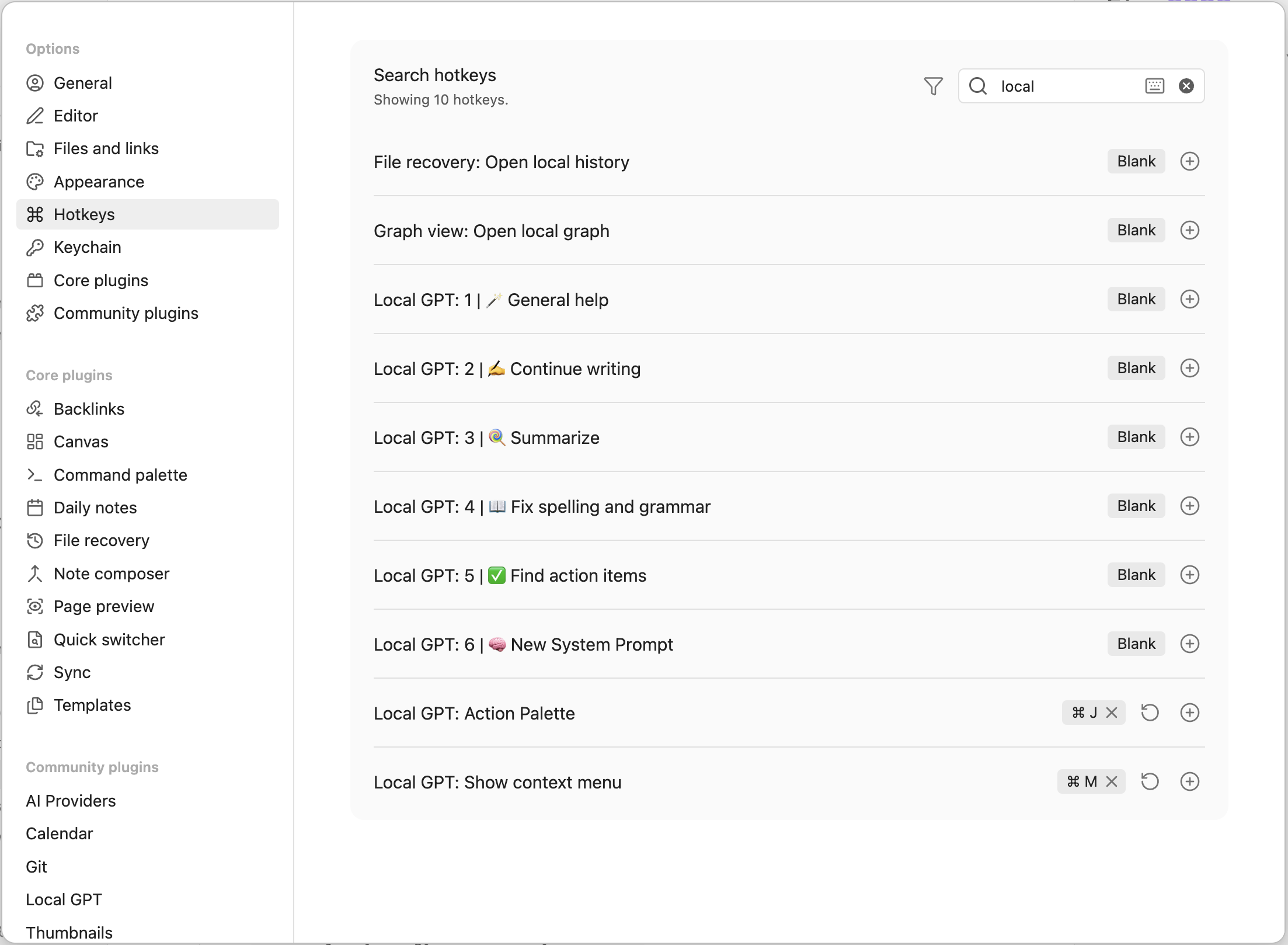To quickly access Local GPT features, set up hot keys in Obsidian.