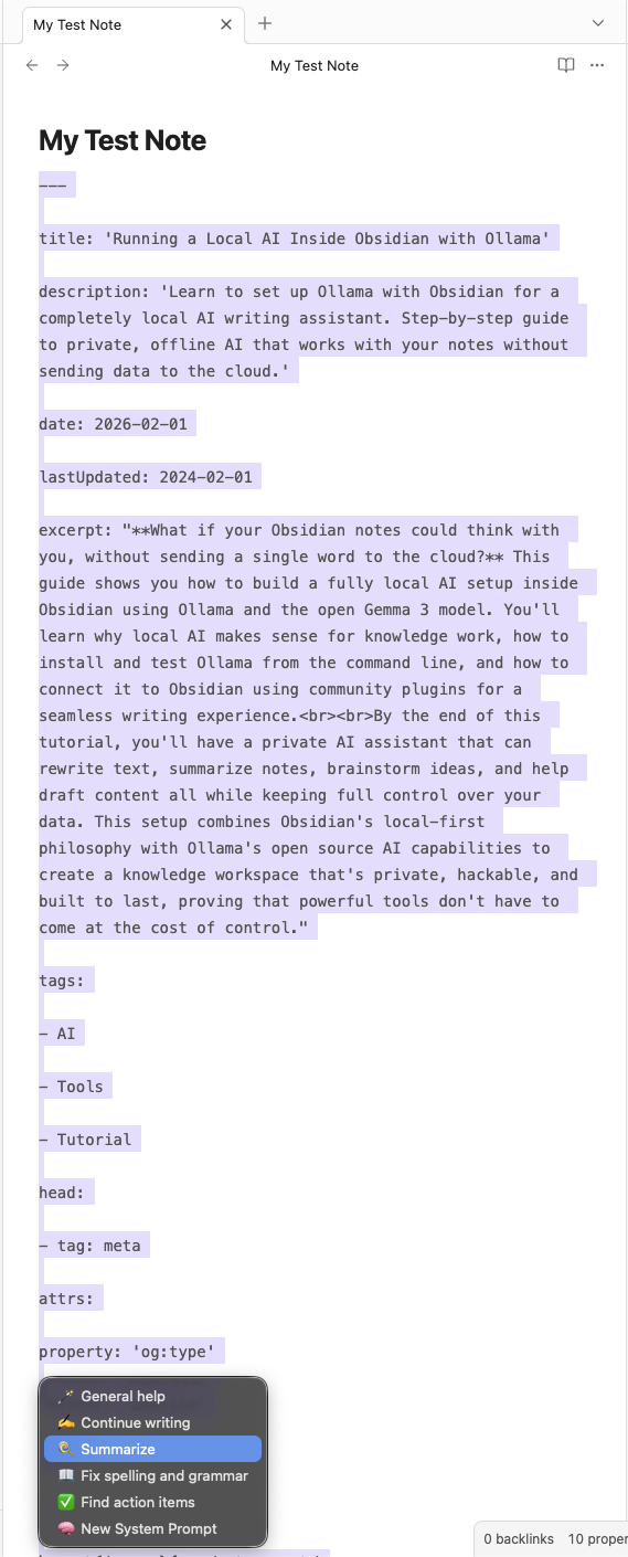 Let’s say I’ve written this article in Obsidian first and wanted to summarize it. I would select the text and use the context menu to choose “Summarize”.