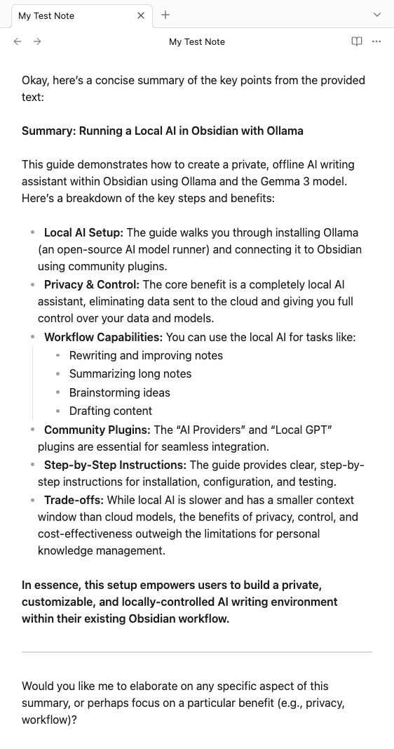 Now that everything is set up, it’s time to test Local GPT inside Obsidian.
